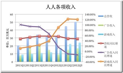 时至今日,人人已经基本上成为一个游戏公司,11年Q4的季报中,广告收入还在游戏收入之上,进入12年后,游戏收入则开始相对大幅提升。从增速上看,人人游戏早就开始一路上扬,而人人广告则从11年Q1就开始回落了。