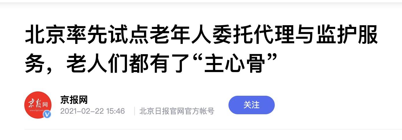 2020年,北京地区曾推出“老年人委托代理与监护服务试点”,派遣社工帮助老人完成养老方面的所有事宜,包括陪同就医、担任老人入住养老机构的担保人,以及管理和保护老人财产、代理老人诉讼,料理老人身后事务等问题。