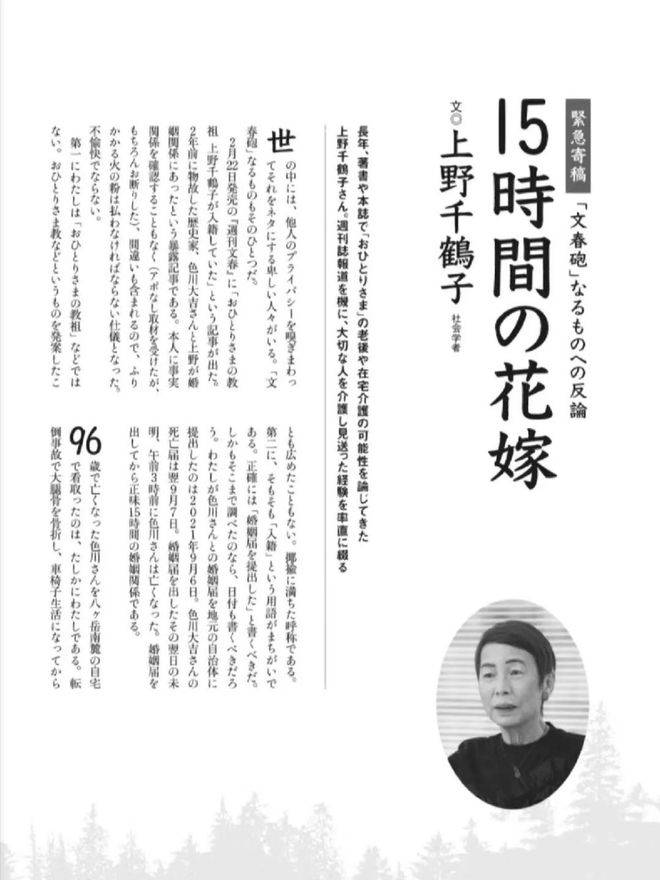 婚后15个小时,色川撒手人寰,只做了“15个小时新娘”的上野千鹤子终于拿到了为他处理后事的通行证——“名分”。