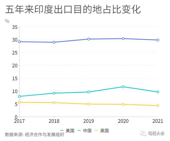 近年来,印度对美国出口份额一直保持在30%左右,对中国出口排在第二位,份额10%左右,且这种格局长期没有太大变化,美国对其商品的需求直接可影响印度的出口走势。