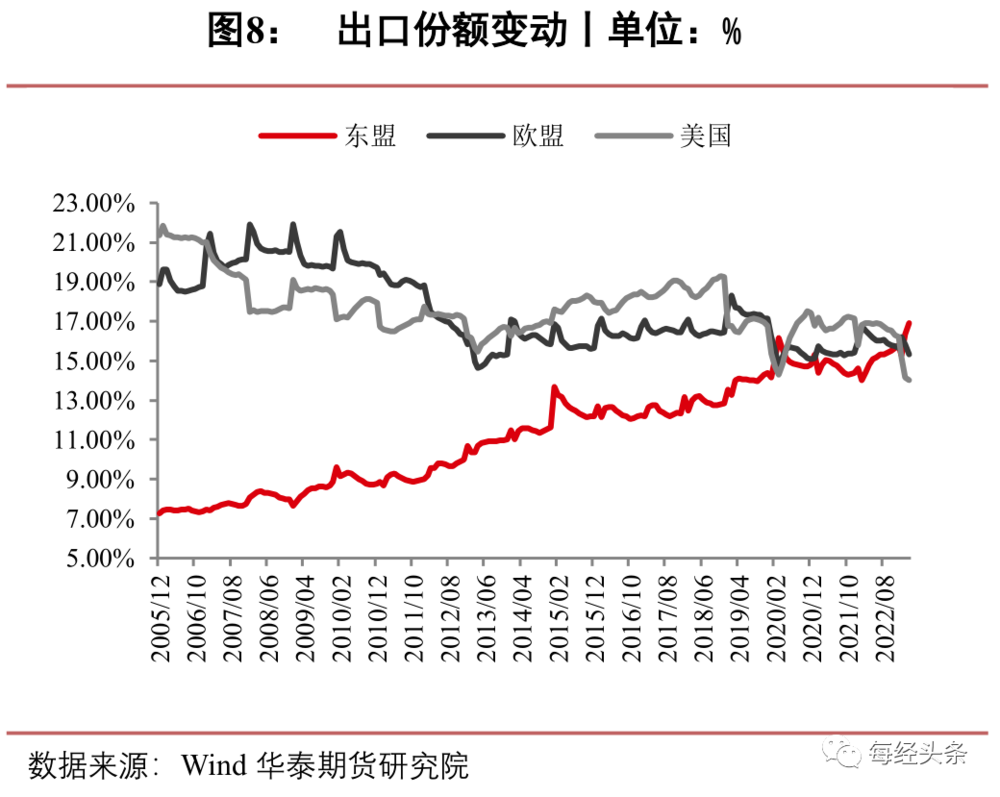 华泰期货研报指出,外贸结构不断优化,新兴市场国家进口需求增加抵消部分欧美地区进口的下滑。新兴市场国家和地区在我国的外贸结构中占有越来越重要的位置,东盟已经成为我国第一大贸易伙伴,截至2023年3月份,出口份额由2005年的7%大幅攀升至目前的16.9%。