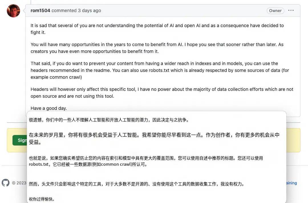 这段对话来自图片抓取工具 Img2dataset 的 GitHub 页面,争论的双方,是被抓取图片的网站站长 Eden,和抓取工具的开发者 Romain。