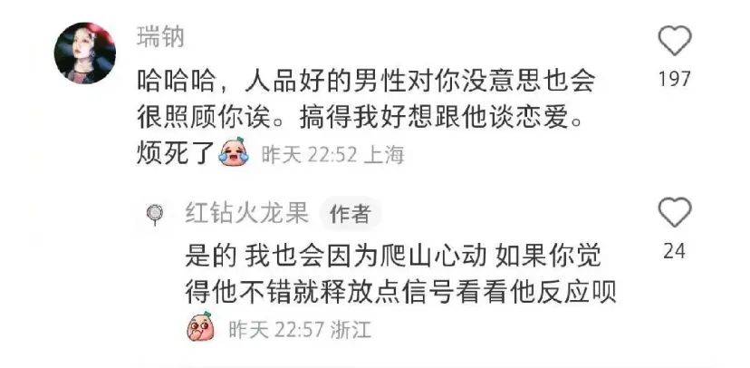 还有网友表示,如果只是头几次约会选择了爬山,加上选的都是当地一两个小时就能爬完的平缓小山,那么男生为了追求女生很有可能会在过程中努力演戏,根本达不到检验的效果。