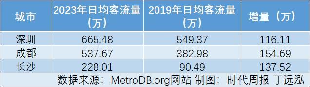 在MetroDB.org网站有完整数据记载的城市中,成都、长沙和深圳3个城市的2023年客流量一直保持在较高水平,相较于2019年的日均客流量,均有超100万的增加。