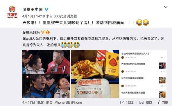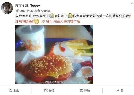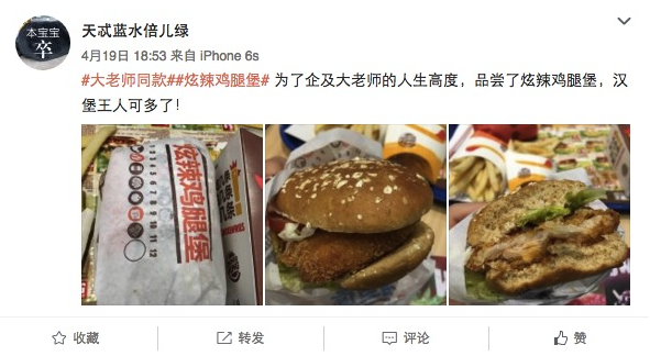 嗯,贝爷这节目虐惨了不少明星,但是明明是去年的节目......也不知道怎么的,大概是大老师的表情太真挚,反正这几天,他口中好吃哭的“ 炫辣鸡腿堡”成了新晋网红。 一大波人赶到各地的汉堡王进行拔草行动: