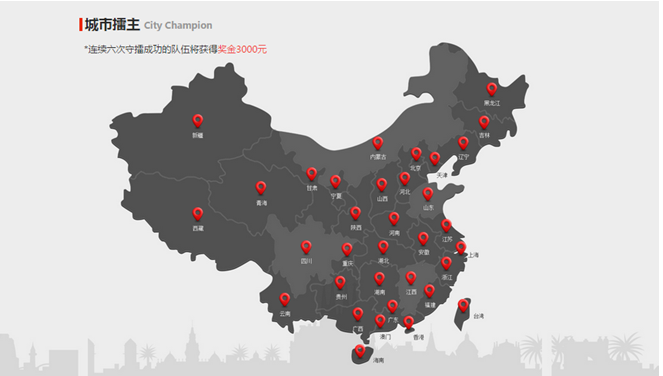 3、线下月赛:每个项目通过前三周比赛决出的选手将晋级第四周的线下月赛。月赛将落地全国各大城市,以现场活动的形式进行为期两天的各项目月冠军赛。月赛举办地点:上半年为北京、广州、成都,下半年则为西安、郑州、深圳。