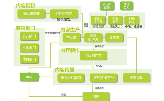 TGA产业链上有一套完整的上下游供应商体系,从游戏研发商到运营方游戏授权,到俱乐部和经济公司的赛事执行,到节目制作方的发行,通过在线直播平台和电竞媒体将完整的比赛带给玩家。