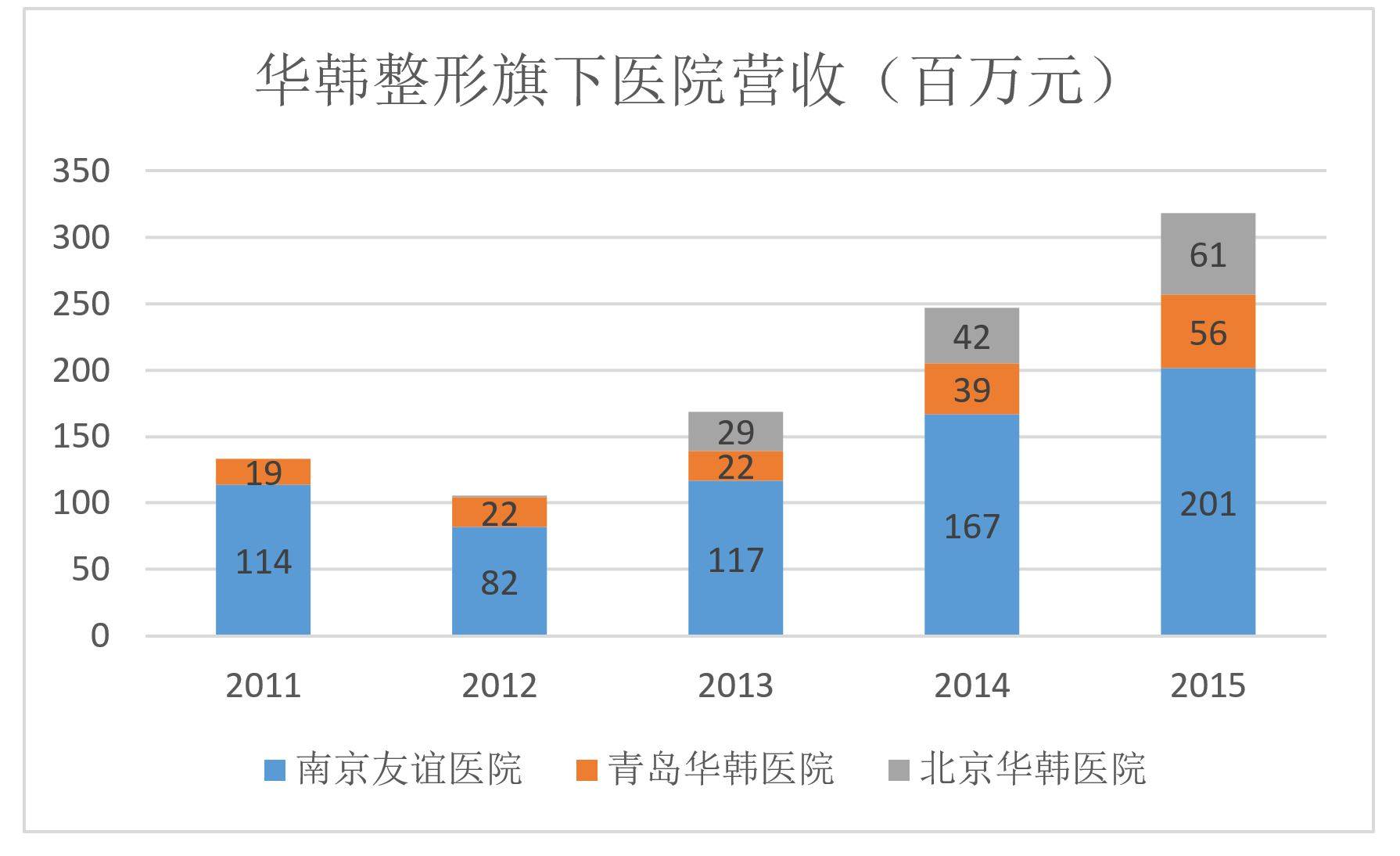 2011年,南京友谊营收为1.14亿,占华韩整形总营收的85%;2015年南京友谊营收突破2亿,年均复合增长率15.2%,在总营收中的比重降至60%。