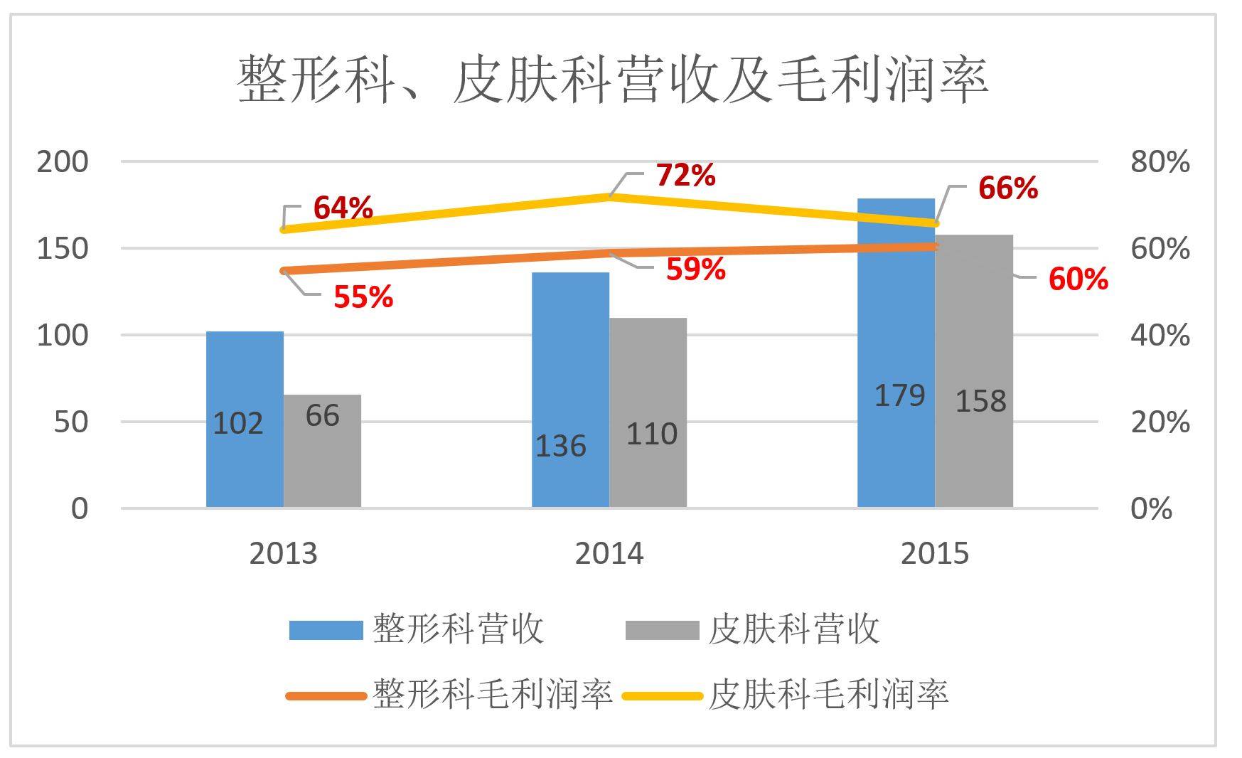 华韩整形的业务按属性分为整形科、皮肤科及牙科。牙科一直亏损,2015年营收178万,直接成本291万,毛利润为负的113万。