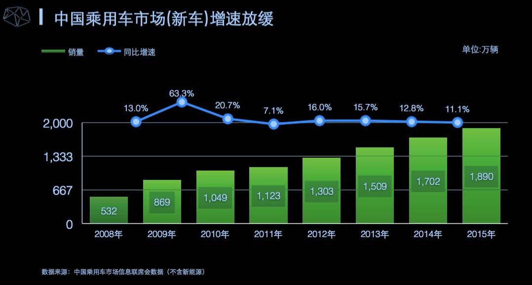 第一,中国乘用车市场到底现在是什么样的(私家车)。大家看到的是从2014年—2015年,整个中国乘用车增长的数据,增速最多的是在2009年,达到了63%的同比增速,但是从2014年到2015年,基本上是从12.8%往下掉。