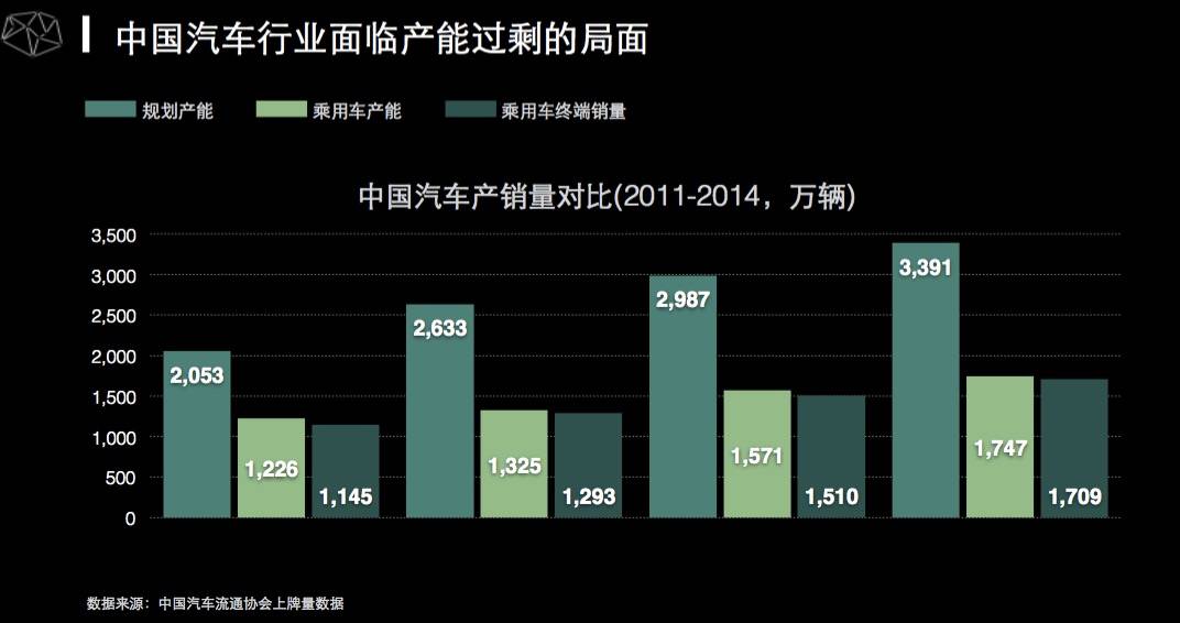 第二,汽车行业面临产能过剩的局面。左边柱子,是中国的汽车厂商对自己产能的规划,规划大概就是这些厂商会投资建厂间生产线,都是钱的投入。最后个柱子是实际中国的汽车终端的销售量。所以我们看到这是四年(2011年—2014年),逐年都在增长。也就是说主机厂产能相比于终端的销售量的差距是越来越大的。