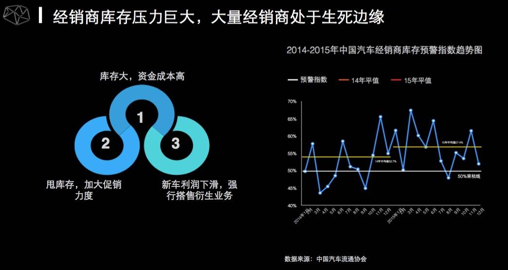 整行业的大环境不好时,汽车厂商的整个库存压力非常大,这“痛”反应在在经销商身上,(下图右边)这张图是2014年、2015年整个汽车经销商的库存预警已经超过50%,按照这个数字来说,超过50%预警指数就要面临非常严峻的经营挑战,而实际上2014年的行业平均指数是52.7%,2015年已经上升到了57.4%,我们预计中国的整个汽车行业库存预警指数还将持续上升。