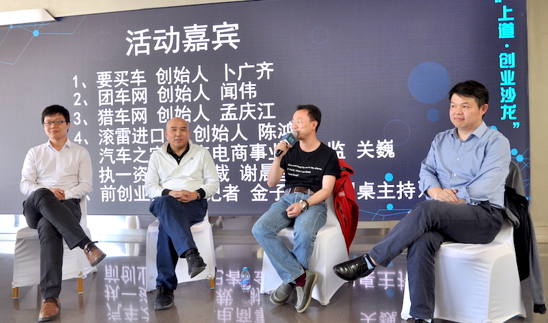 (图中从左至右分别为:汽车领域资深记者金子琦、执一资本副总裁谢晨星、滚雷进口车创始人陈鸿、团车网创始人闻伟、要买车创始人卜广齐。)