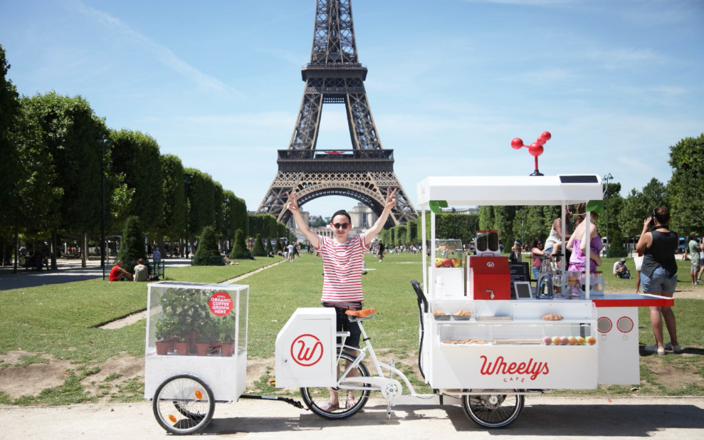 为什么叫它咖啡车呢?因为它确实是一个长在三轮车上的可移动咖啡馆,“三轮”这俩字容易让人脑补一堆俗物,比如走街串巷的煎饼果子摊,但其实Wheelys长成这个样子: