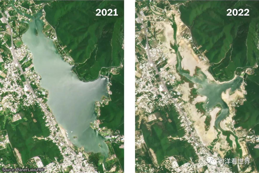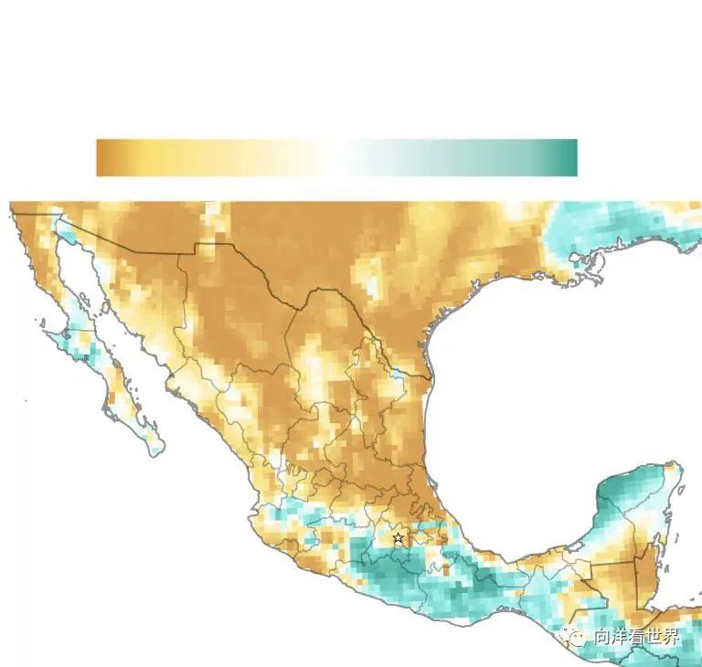 上图是墨西哥一个城市水库在2021年与2022年相同月份的比较,肉眼可见水库在枯竭。下图是墨西哥地下水的分布情况,北部非常缺水。