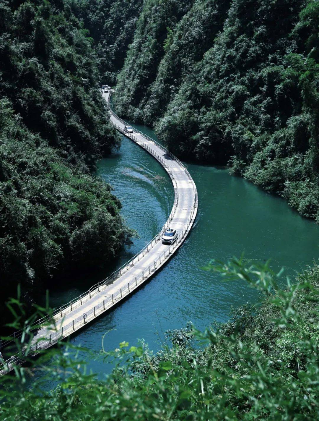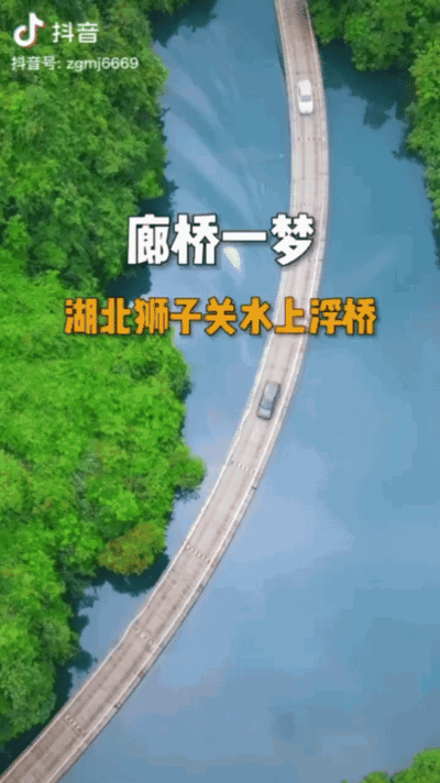 位于湖北省恩施州狮子关景区的“廊桥遗梦”浮桥在视频平台上以“车行碧波上,人在画中游”为主要卖点。/抖音@中国美景推荐