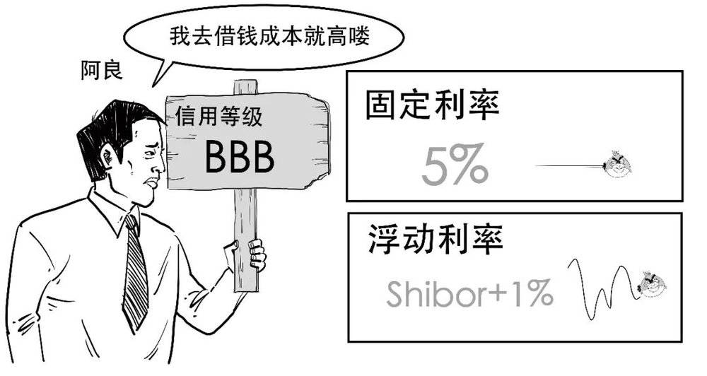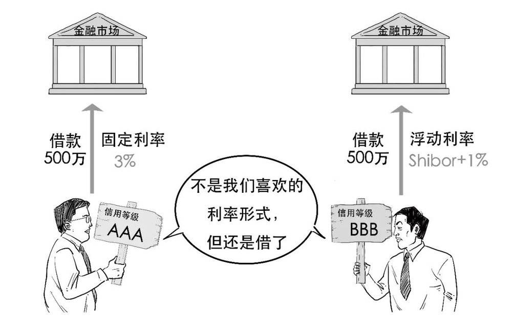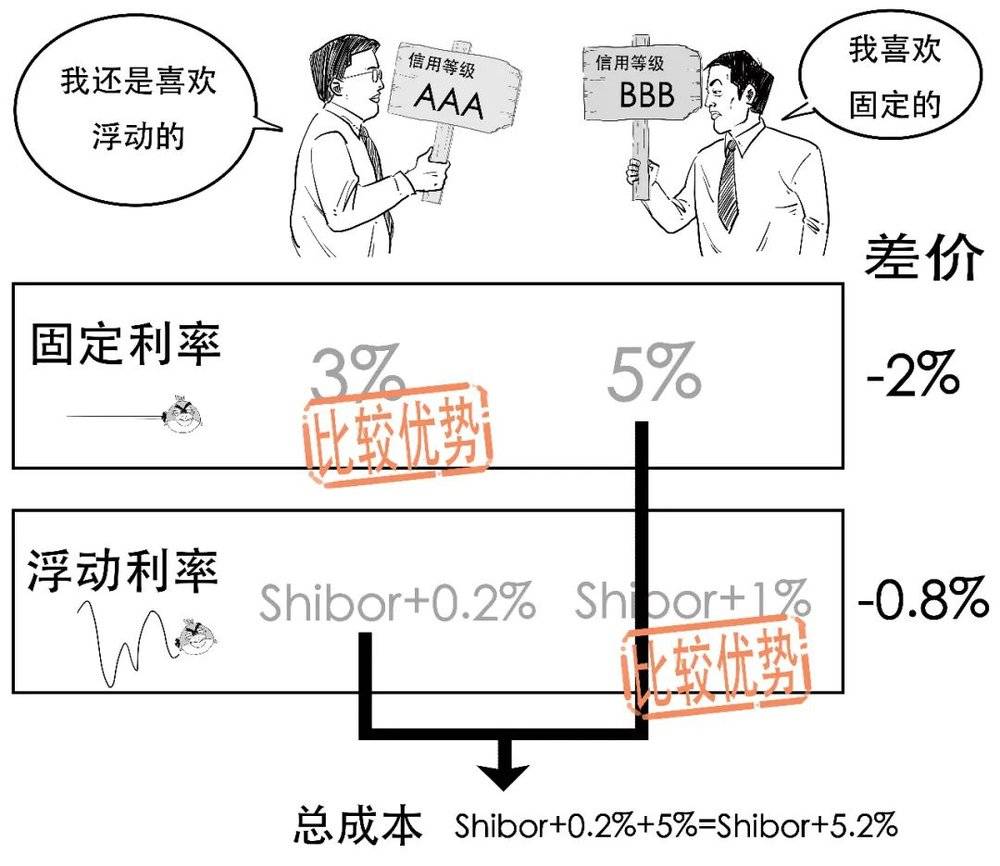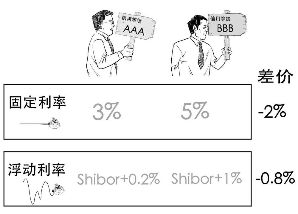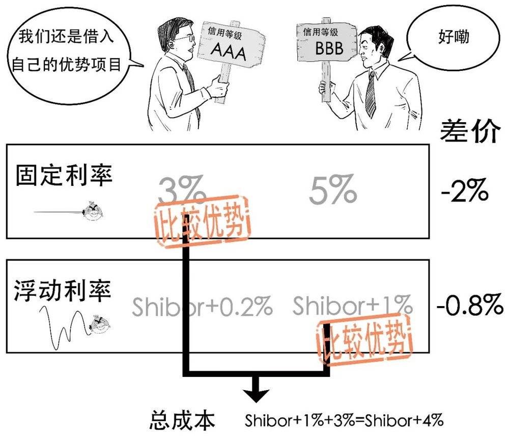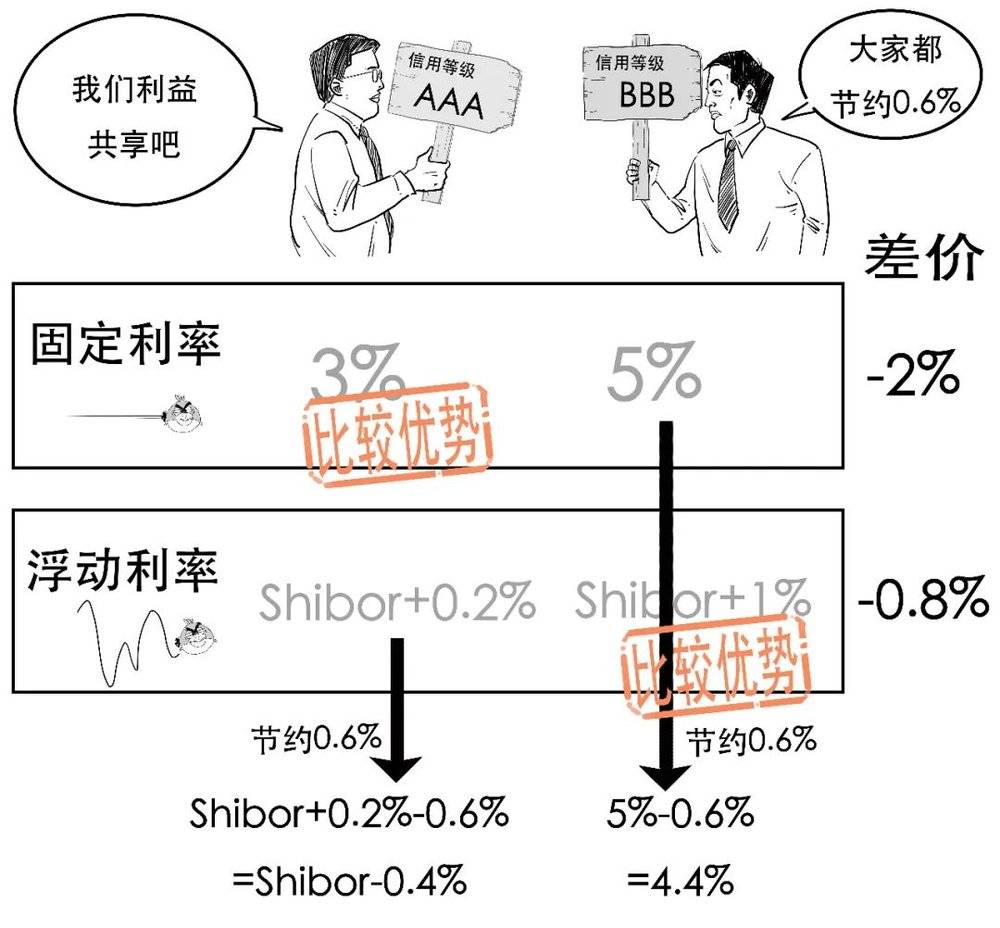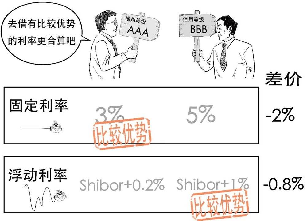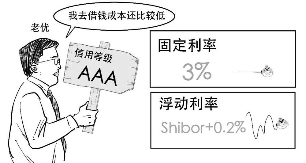 虽然在固定利率上有比较优势,但老优更希望采用浮动利率去借钱;虽然在浮动利率上有比较优势,阿良则希望支付固定利率去借钱。