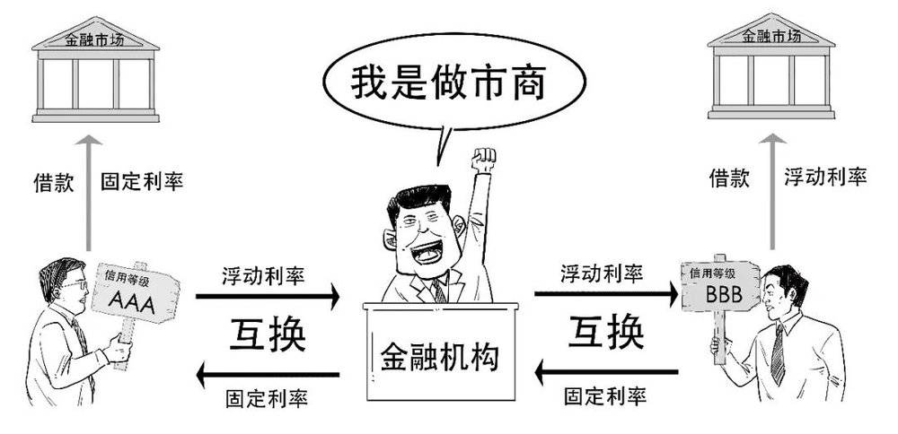但在实际交易中,利率互换的双方并不直接交易,而是利用金融机构作为中介,能提高互换的流动性。
