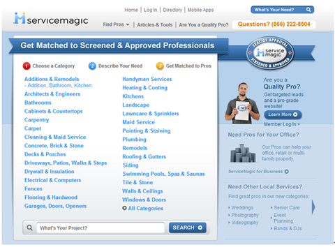 ServiceMagic则主要做本地化生意,通过互联网将家庭以及其他本地专业人员与用户连接起来,其中所有专业人员都由公司筛选过并且大部分都有消费者打分,当用户提交服务请求,ServiceMagic将从数据库中匹配四位专业人员供选择,截止2011年12月31日,ServiceMagic涵盖700多个种类8万名专业服务人员。