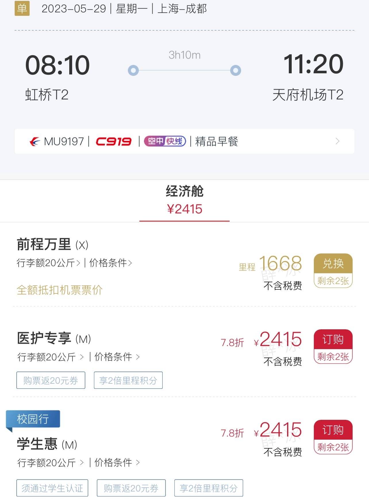 沪蓉航线为东航“空中快线”之一。5月26日起,C919客机执飞的沪蓉航线已经全面开始售票,东航在APP订票页面做了醒目的“C919”红色机型标识。最早一趟航班将于5月29日早上8:10执行,航班号MU9197。据界面新闻记者查询,该趟航班仅剩经济舱可售,且余票紧张。票价也有明显上涨,从最初的900余元已经上涨至2400余元。