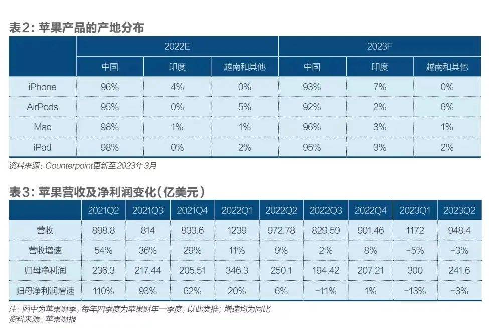 苹果被认为最具韧性,现在也显得吃力。2023财年二季报(为2023年一季度),苹果营收同比下滑2.5%至948.4亿美元,净利润同比下滑3.4%至241.6亿美元,已连续两个季度下滑。对于苹果供应链中的数千家公司来说,这不是一个好兆头。本就不充裕的订单里,飞往越南、印度的多了,飞向中国的就少了。