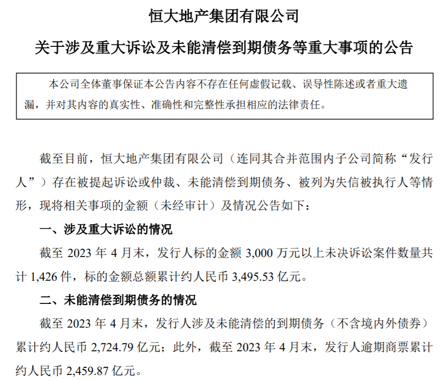 今年5月29日,恒大地产集团有限公司发布关于涉及重大诉讼及未能清偿到期债务等重大事项的公告,截至2023年4月末,发行人标的金额3000万元以上未决诉讼案件数量共计1426件,标的金额总额累计约3495.53亿元。