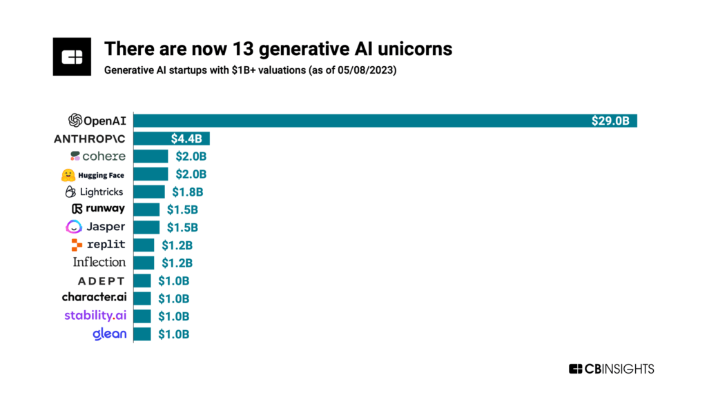 根据CB insights的数据,截至去年年底,全球生成式AI领域的独角兽只有OpenAI、Hugging Face、Lightricks、Jasper、Glean和Stability AI等6家公司,但到了今年5月初,生成式AI独角兽公司数量已经达到了13家。也就是说在不到半年的时间内,生成式AI独角兽公司的数量就翻了一倍。