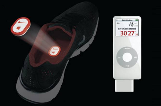 其实早在10年前,苹果就开启了与Nike的合作。2006年的7月14日,苹果和Nike合作推出了一款名为 Nike + iPod 的运动套件,通过无线的方式,内置在Nike跑鞋里的芯片与iPod连接在一起,使用户能够在运动时通过iPod获得并记录其运动时间、运动距离、心跳、消耗的卡路里等数据。这也是全球的第一代可穿戴运动设备。