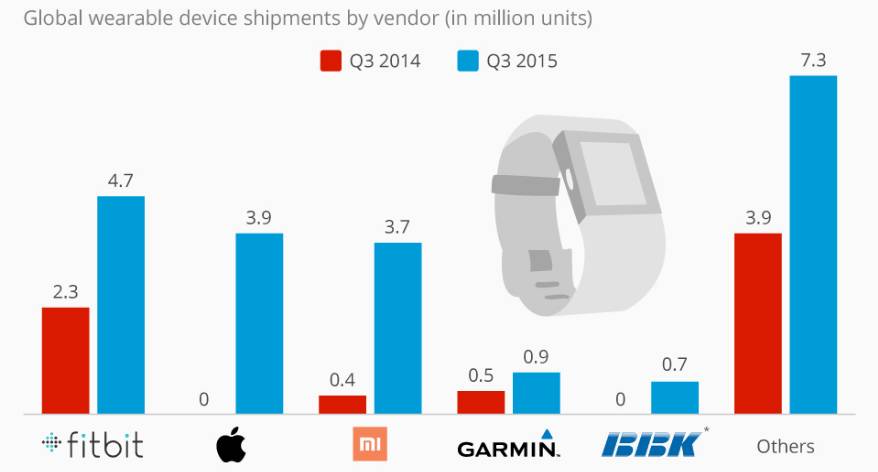 Fitbit诞生于2007年,专注于运动穿戴设备的品牌,依靠其强大、可靠的技术能力和较为亲民的价格,俘获了数百万的消费者。在2015年的第三季度,尽管来势汹汹的Apple Watch的全球供应商发货量维持在了390万台,但fitbit却能够达到470万台,领跑所有运动穿戴设备品牌。