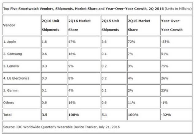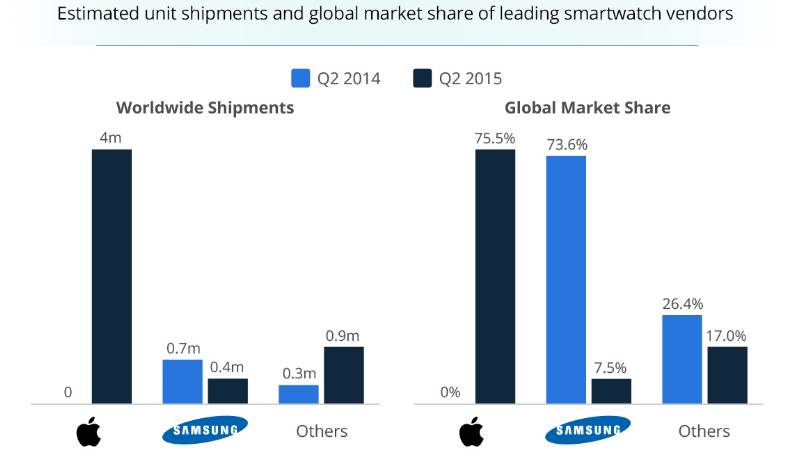 在苹果方面,自2015年4月Apple Watch问世后,其首个季度的全球供应商发货量就达到了400万台,市场份额一下攀升至75.5%。要知道在Apple Watch发布之前,三星的Gear一直在市场独领风骚,占据着73.6%的市场份额。但由于Apple Watch的出现,这个数字骤降到7.5%。