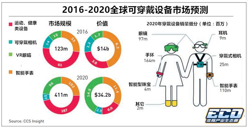 另一家市场研究机构CCS Insight预计,2020年智能穿戴设备的年销量为4.11亿台,总价值达到340亿美元,而这其中运动细分市场的设备将占到1.87亿台。该机构的统计数字显示,目前智能运动穿戴设备的年销量为6100万台,按照他们的预计,在未来的五年里,运动智能装备的销量将翻3番。