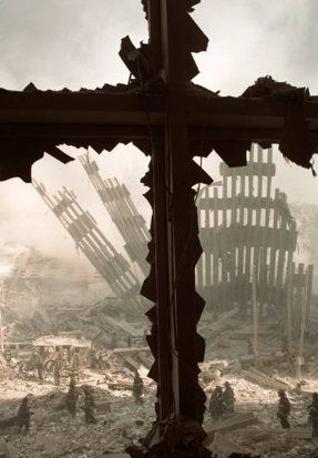 我看着那些照片,确实感受到了空前的视觉冲击。比如有一张照片是摄影师拍摄的9•11废墟上巨型的钢筋残骸。在照片里,这根倒塌的钢筋残骸自然地断裂成了一个巨型十字架的形状。人们从“十字架”的底部望向苍穹,而在十字架的远处,是朦胧的还未散去的废墟烟雾和断开散列的大厦筋骨,灾难片一般的混乱正在四处蔓延。