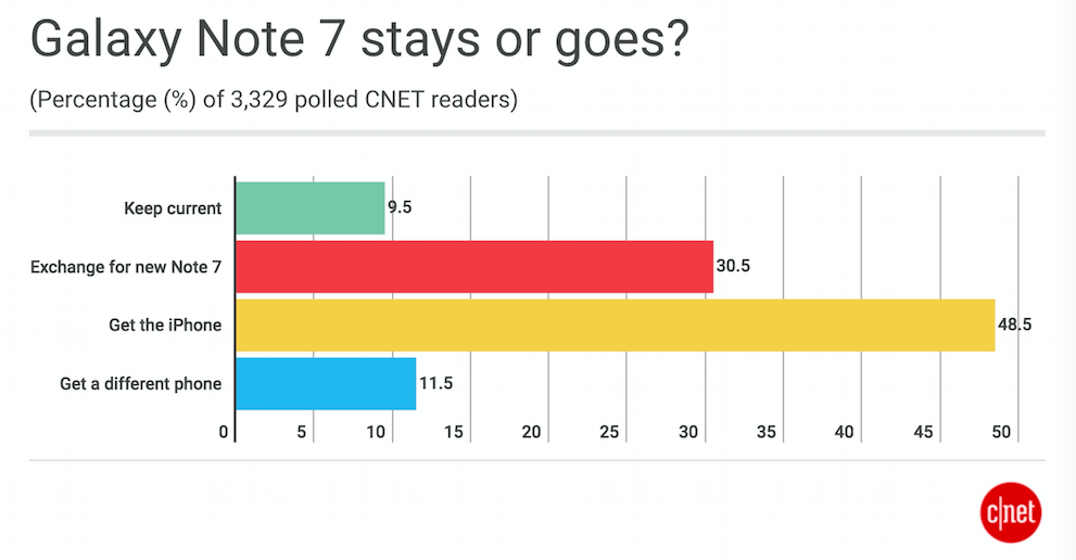 近日,有3329位网友参与了CNET的调查,其中近半人士已转投iPhone,但也有30.5%的Note 7忠粉选择置换新机后仍会沿用Note 7。