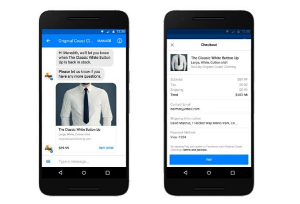 在今年 4 月的 F8 大会上,Facebook在Messenger 中推出了第一代聊天机器人,商家可以提供自动化互动体验,电商向导和客户支持服务。商家在与客户互动的过程中,不仅可以发送文字,还可以发送图片、超链接。用户可以跳转到网页上,完成购物。