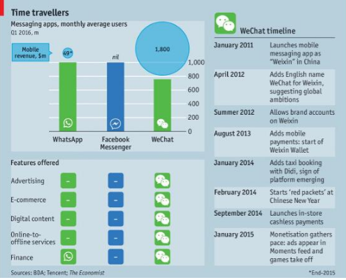 虽然微信的活跃用户数量增长慢于Facebook,但在货币化和用户参与度上,微信却是一马当先。 据KPCB分析师玛丽•米克估计,中国用户平均每天使用微信70分钟。而Facebook表示,其用户每天在Facebook、Instagram和Messenger上花的时间总共约为50分钟。