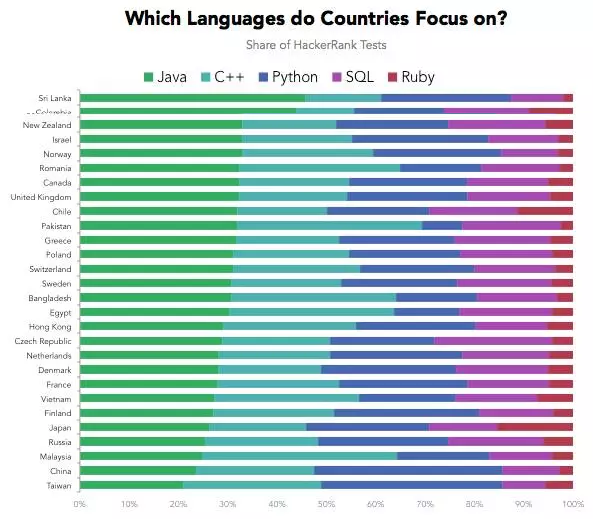 总的来说,各国程序员对 Java 挑战的参与度要高于任何其他编程语言挑战(也有少数例外,例如马来西亚和巴基斯坦的程序员更喜欢参与 C++ 挑战,而在台湾,Python 挑战最受欢迎)。斯里兰卡对 Java 挑战的偏爱度排名第一。而为 HackerRank 贡献了大量程序员用户的印度位列第八。