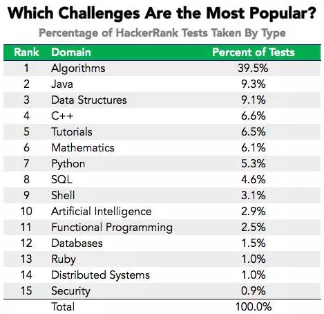 ▲ 这张表格展示了 HackerRank 上最多人完成的项目。前三名分别是算法、Java、数据结构