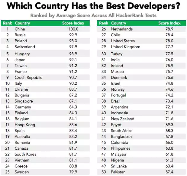 印度和美国虽然贡献了最多数量的程序员,但甚至没有进入到榜单的前半部分。印度得到了 76 分,名列 31 位;美国得到了 78 分,名列 28 位。