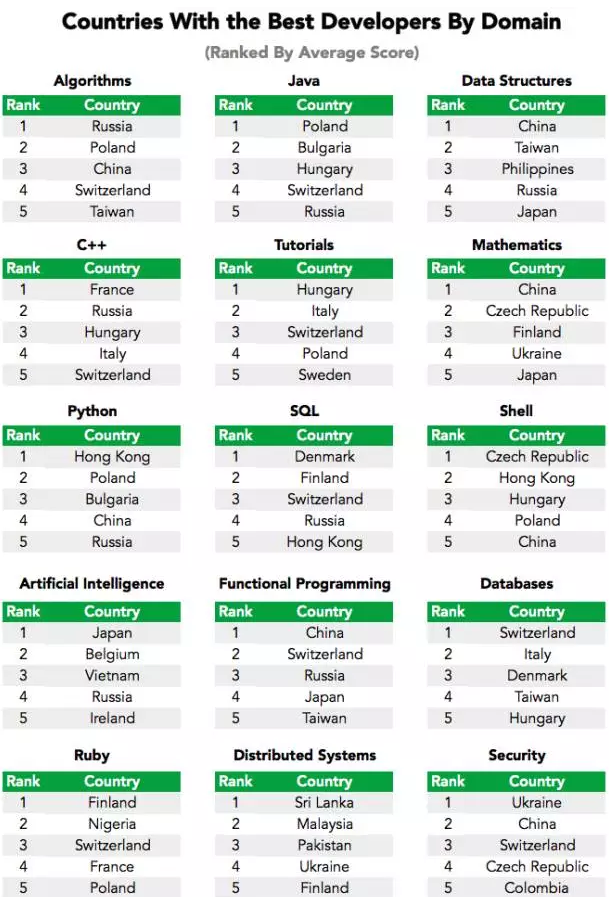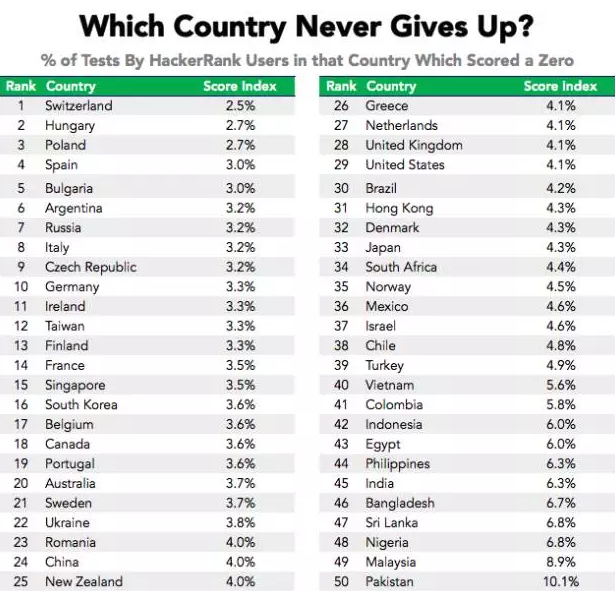 巴基斯坦、斯里兰卡和尼日利亚在榜单中垫底,这些国家的程序员可以向瑞士程序员学习他们的坚韧不拔的精神。当一名程序员在 HackerRank 进行挑战时,如果在挑战开始就放弃,那他/她只能得到零分。而在所有国家中,瑞士程序员的零分比例最低,这也使瑞士程序员成为当之无愧的 “全世界最顽强的程序员”。
