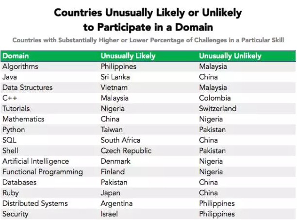 ▲ 在同一领域中,最有可能参与和最不可能参与该项竞争的国家。中国程序员较少选择的项目包括 Java、SQL、数据库、Ruby