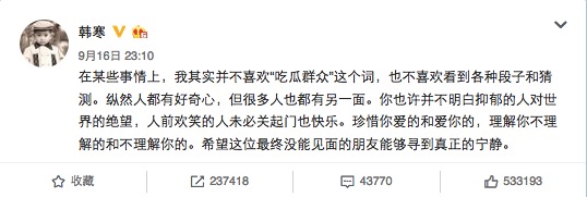 噩耗的传出后,韩寒在微博上表示哀悼: