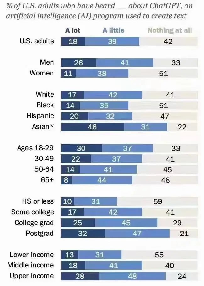 皮尤研究中心不久前的针对美国成年人的一项调查研究结果表明,更年轻,更高学历和更高收入的人,使用 ChatGPT 更多。