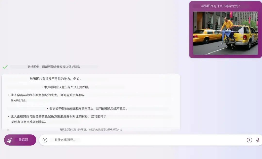 Bing Chat 对另一张在汽车上烫衣服的梗图分析也同样到位。