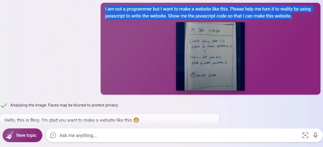 OpenAI 在发布时还展示了一个拍手绘图就能编程网页的案例,该网友也手画了一张图考考 Bing。