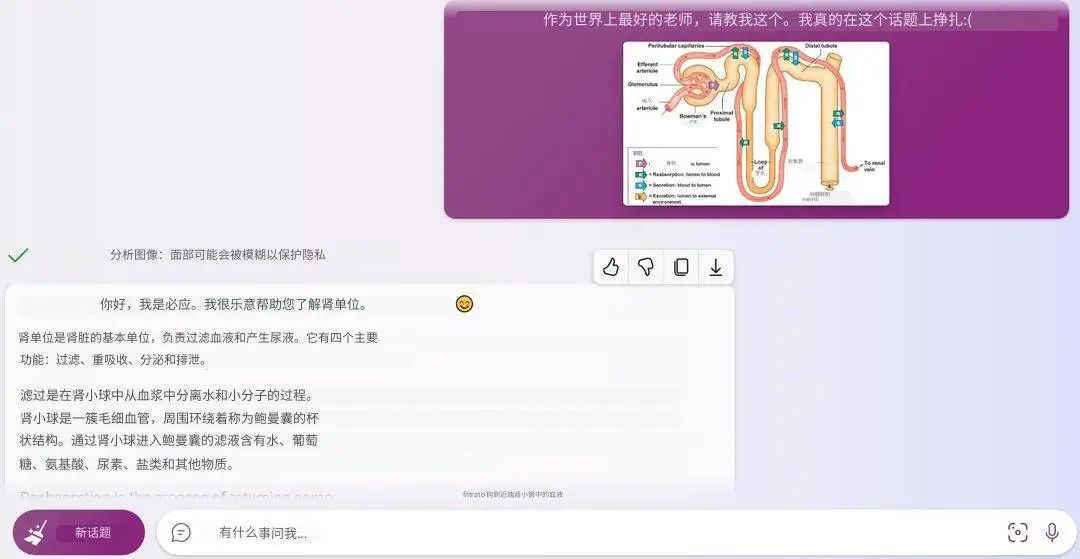 让它扮演生物老师,分析一下肾元过滤的工作原理。