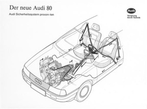也就是当正面碰撞发生时,发动机会被向后推,而奥迪发动机上牵连着的钢缆会给方向盘一个反作用力,将方向盘同时远离驾驶员,并且拉紧驾驶员身上的安全带。这一功能一直沿用到了1994年。直到气囊成为很多国家道路安全法规的标配后才不得不下线。