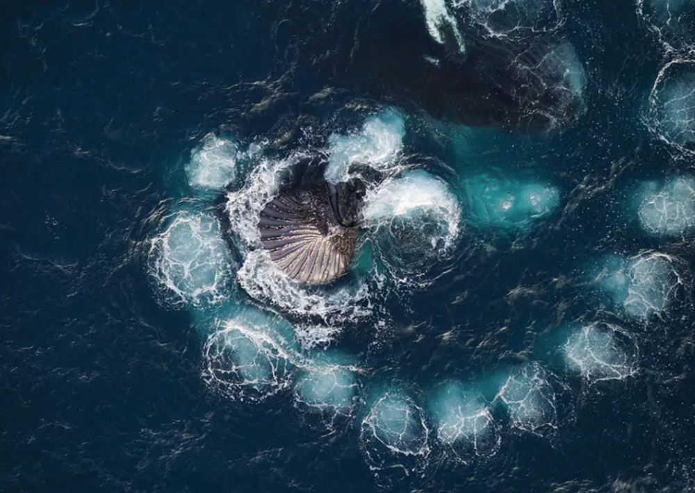 座头鲸的进食方式已经为人所知。它们利用鲸须过滤海水,这种角蛋白板分布于上颌,像极了旧牙刷的刷毛。座头鲸每天需要吞下几千磅食物,为了获取这么多食物,它们必须找寻甲壳类动物聚集的地方。一旦找到一大群磷虾,它们就会聪明地采取合作捕食策略,将猎物围在中间,同时吹出气泡柱,形成“渔网”。然后,它们开始进食,张大嘴巴猛地扑向紧紧聚集在一起的猎物,利用充满褶皱的喉袋吞下数千加仑满是磷虾的海水,再用鲸须过滤。