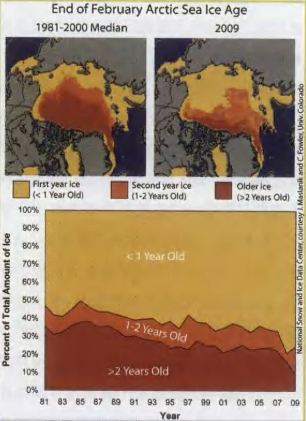 这幅图显示了截至2009年2月底,北极海冰的相对年龄随年份变化的情况。2009年冬天覆盖北冰洋的主要是较薄的一年生冰。