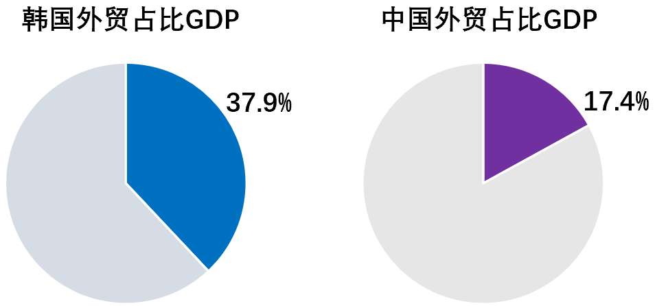 说到出口,就不得不提一下韩国的经济结构。与中国不同,韩国人口只有5174万,国内市场较小,经济较依赖出口,根据中国国际贸易促进委员会的数据,2021年韩国的出口贸易占国内实际GDP的比重是37.9%。