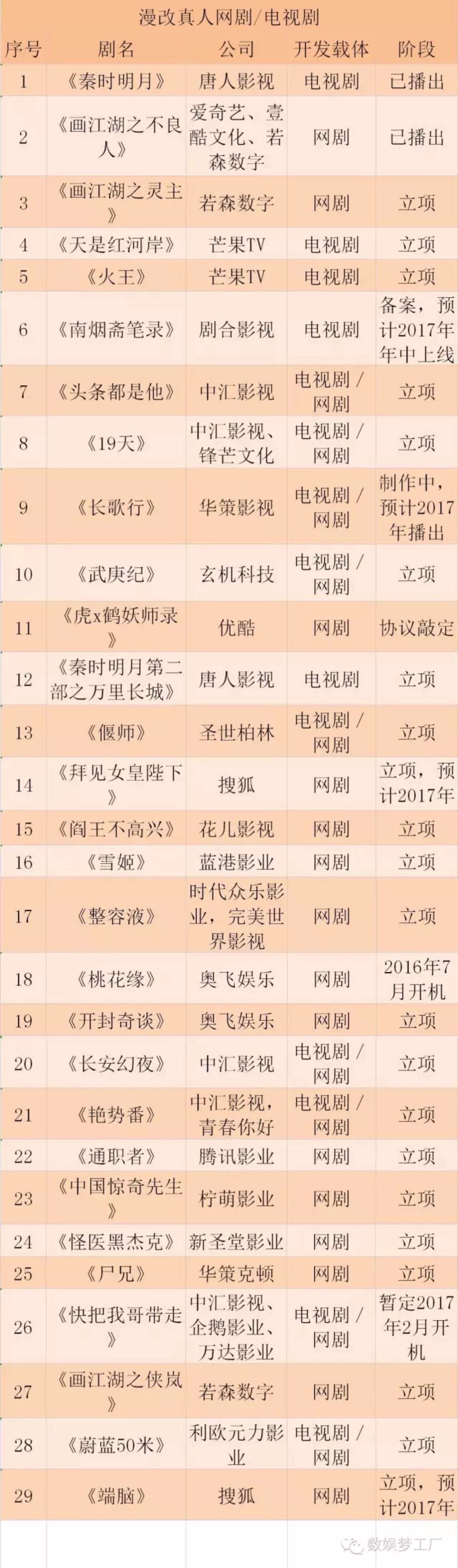 根据数娱梦工厂不完全统计,截至2016年10月,已完成和正在筹划中的漫改真人影视项目已经高达41个。这其中包含了由漫画改编的真人电视剧和网剧(下简称“漫改真人剧”)的29部,以及由漫画改编的真人电影(下简称“漫改电影”)10部。